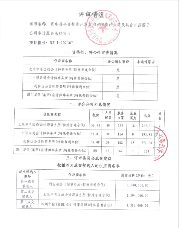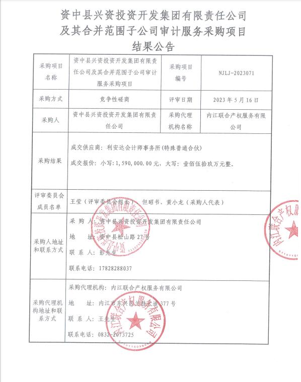 資中縣興資投資開發(fā)集團(tuán)有限責(zé)任公司及其合并范圍子公司審計服務(wù)采購項(xiàng)目結(jié)果公告