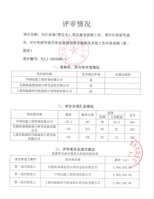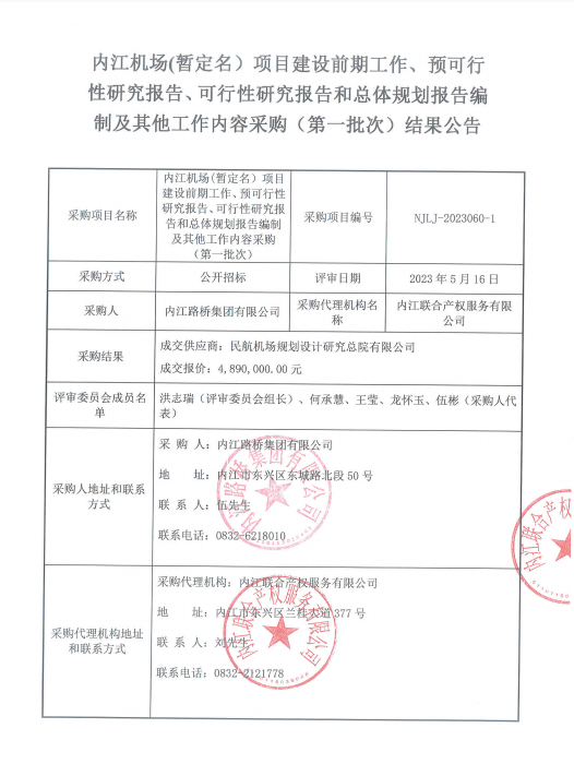 內(nèi)江機場(暫定名)項目建設(shè)前期工作、預(yù)可行性研究報告、可行性研究報告和總體規(guī)劃報告編制及其他工作內(nèi)容采購(第一批次)結(jié)果公告