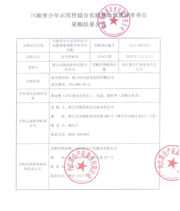 川渝青少年示范性綜合實(shí)踐基地預(yù)算評(píng)審單位采購(gòu)結(jié)果公告