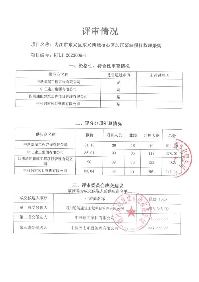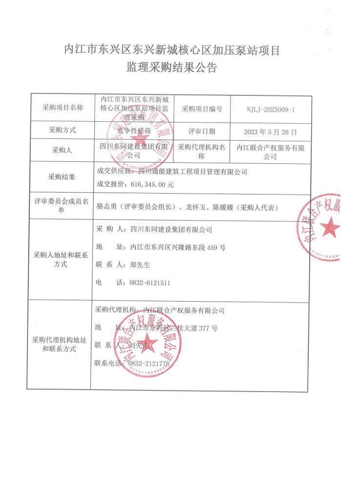 內(nèi)江市東興區(qū)東興新城核心區(qū)加壓泵站項(xiàng)目監(jiān)理采購(gòu)結(jié)果公告