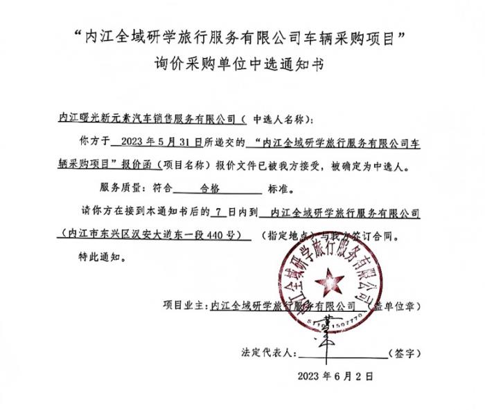 “內(nèi)江全域研學(xué)旅行服務(wù)有限公司車輛采購(gòu)項(xiàng)目”詢價(jià)采購(gòu)單位中選通知書