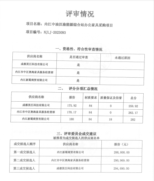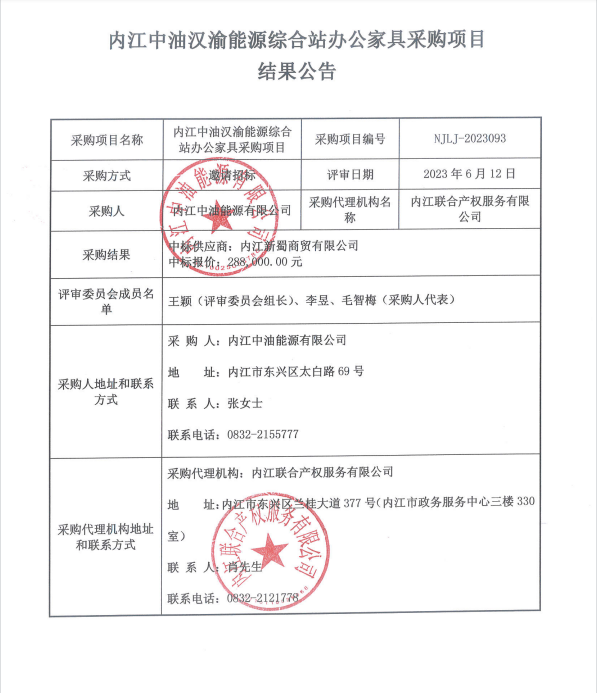 內(nèi)江中油漢渝能源綜合站辦公家具采購項目結(jié)果公告