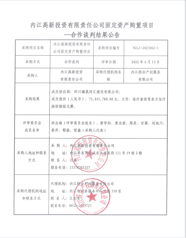 內江高新投資有限責任公司固定資產購置項目合作談判結果公告