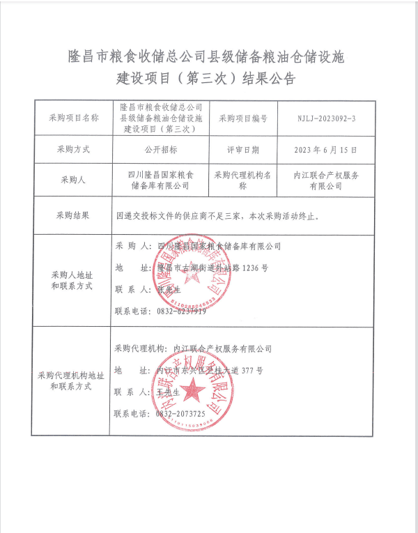 隆昌市糧食收儲(chǔ)總公司縣級(jí)儲(chǔ)備糧油倉儲(chǔ)設(shè)施建設(shè)項(xiàng)目(第三次)結(jié)果公告