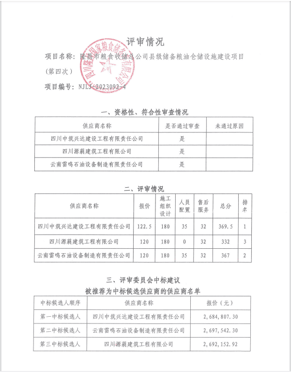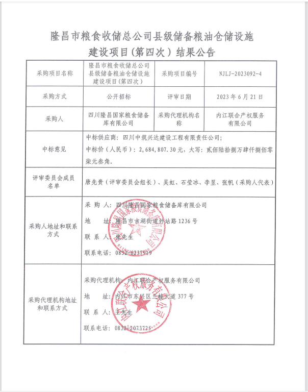 隆昌市糧食收儲總公司縣級儲備糧油倉儲設(shè)施建設(shè)項目(第四次)結(jié)果公告