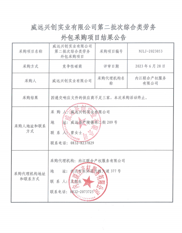威遠(yuǎn)興創(chuàng)實業(yè)有限公司第二批次綜合類勞務(wù)外包采購項目結(jié)果公告