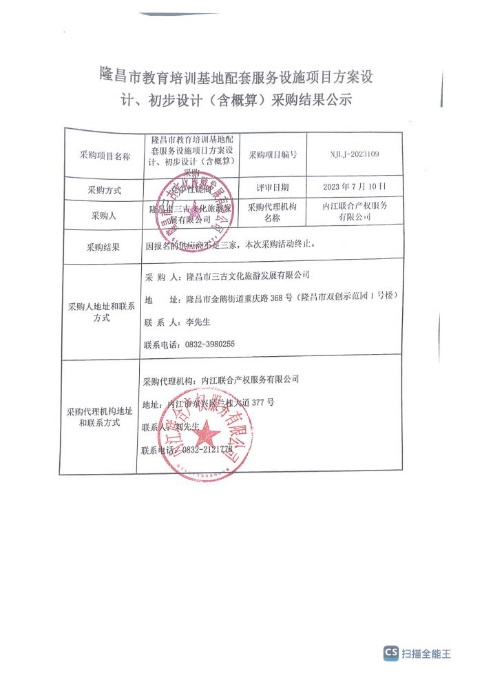 隆昌市教育培訓基地配套服務設施項目方案設計、初步設計(含概算)采購結果公示