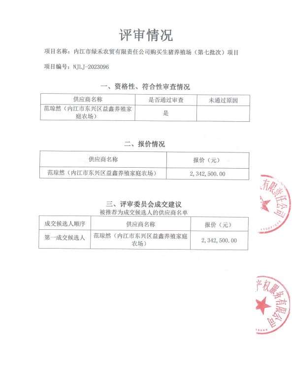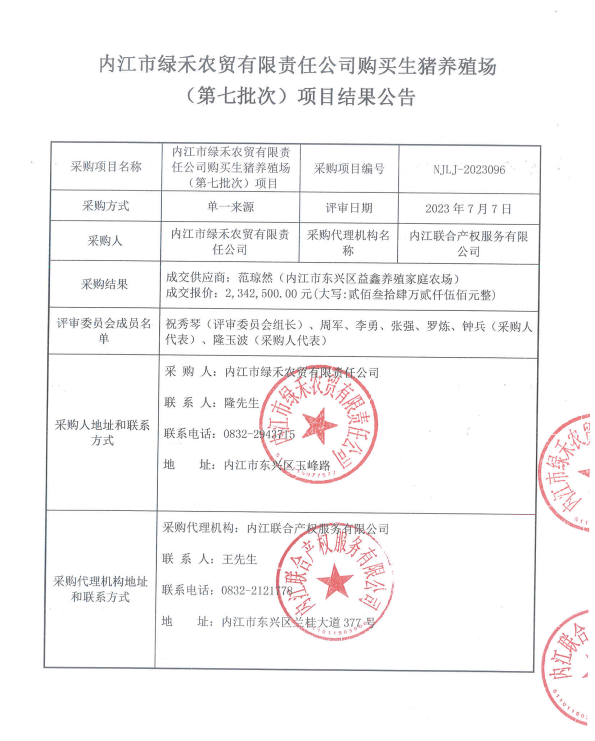 內(nèi)江市綠禾農(nóng)貿(mào)有限責(zé)任公司購買生豬養(yǎng)殖場(第七批次)項目結(jié)果公告