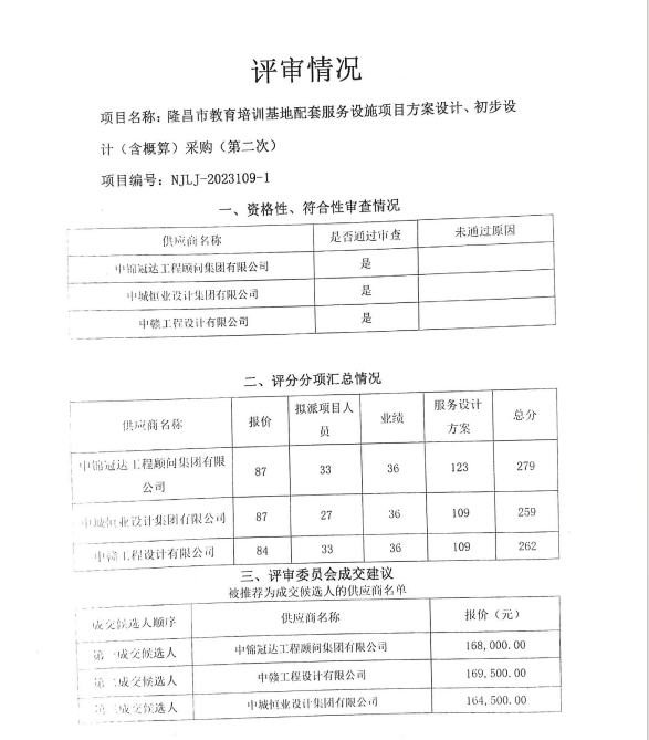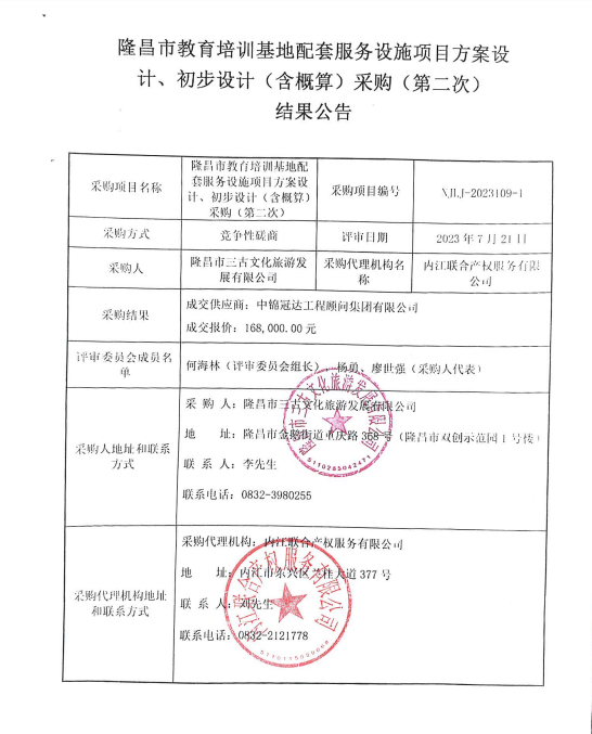 隆昌市教育培訓(xùn)基地配套服務(wù)設(shè)施項(xiàng)目方案設(shè)計、初步設(shè)計(含概算)采購(第二次)結(jié)果公告