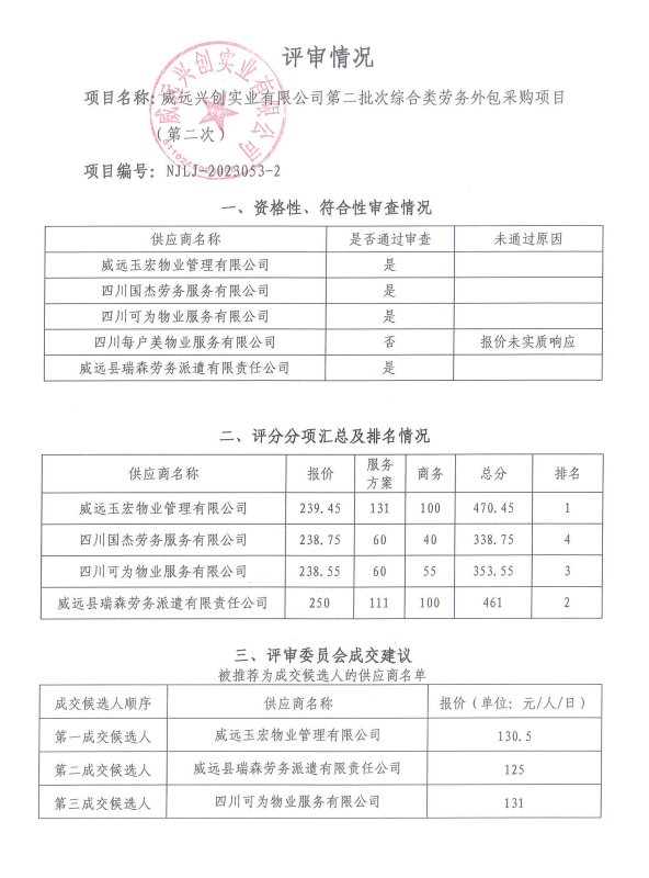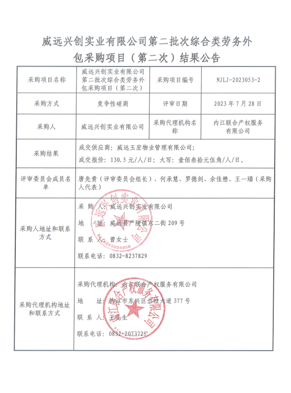 威遠(yuǎn)興創(chuàng)實(shí)業(yè)有限公司第二批次綜合類勞務(wù)外包采購(gòu)項(xiàng)目(第二次)結(jié)果公告