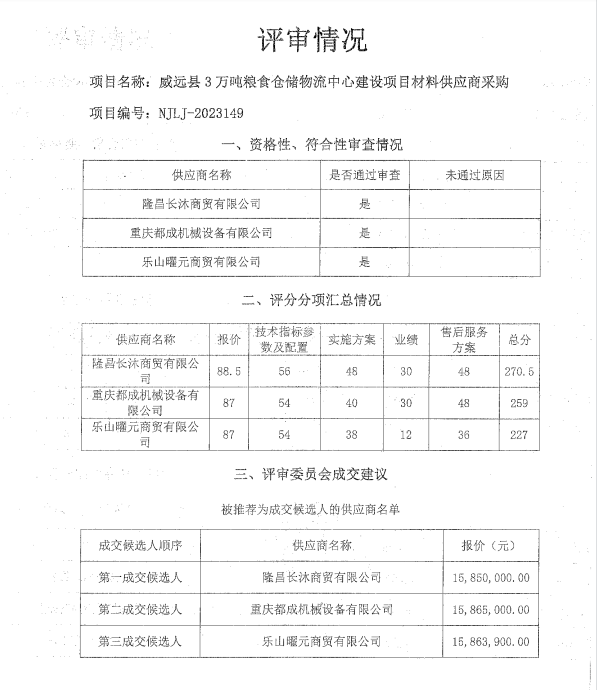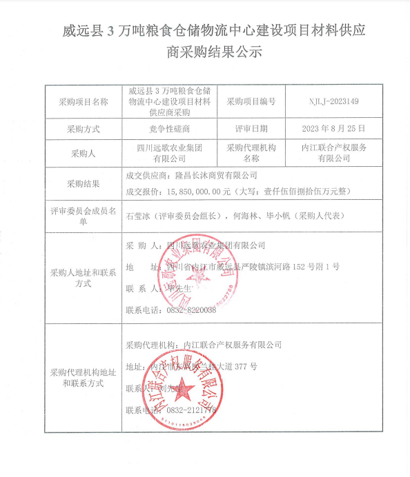威遠(yuǎn)縣3萬噸糧食倉儲物流中心建設(shè)項目材料供應(yīng)商采購結(jié)果公示