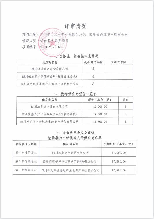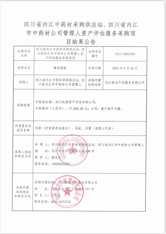 四川省內(nèi)江中藥材采購供應(yīng)站、四川省內(nèi)江市中藥材公司管理人資產(chǎn)評估服務(wù)采購項目結(jié)果公告