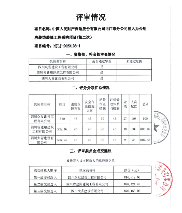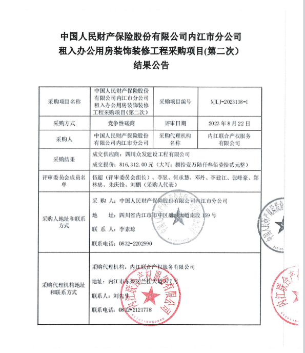 中國人民財產(chǎn)保險股份有限公司內(nèi)江市分公司租入辦公用房裝飾裝修工程采購項目(第二次)結(jié)果公告