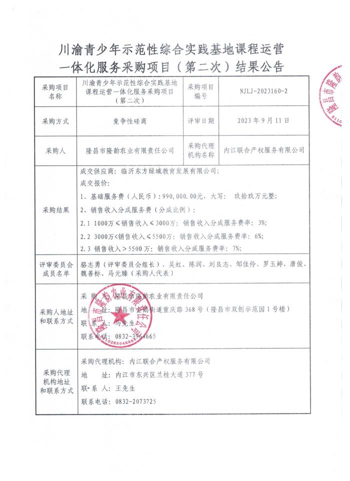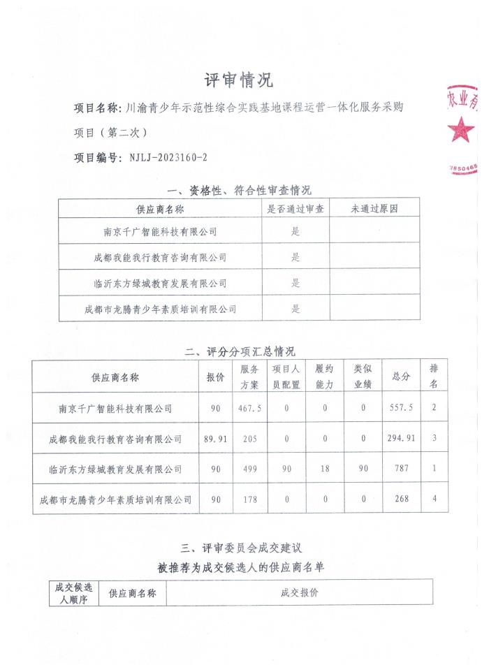川渝青少年示范性綜合實踐基地課程運營一體化服務(wù)采購項目 (第二次)結(jié)果公告