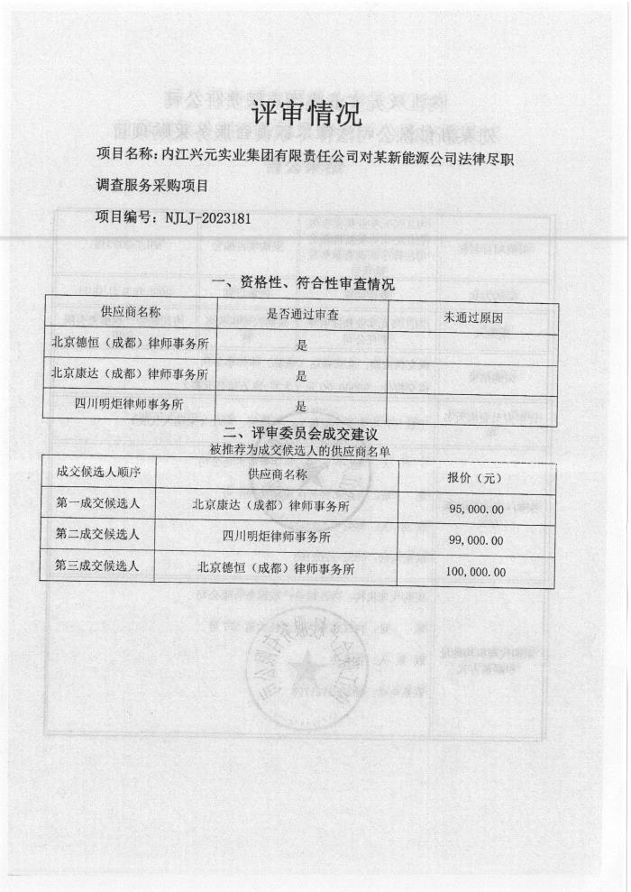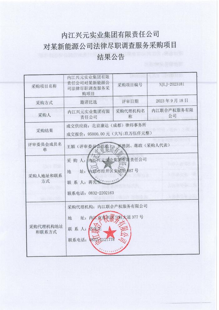 內(nèi)江興元實業(yè)集團有限責任公司對某新能源公司法律盡職調(diào)查服務采購項目結(jié)果公告