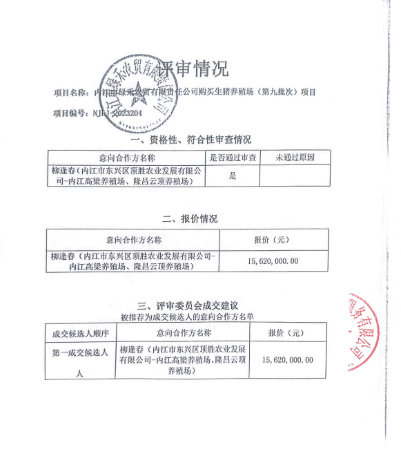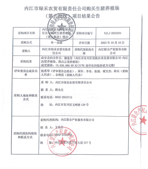 內(nèi)江市綠禾農(nóng)貿(mào)有限責任公司購買生豬養(yǎng)殖場(第九批次)項目結果公告