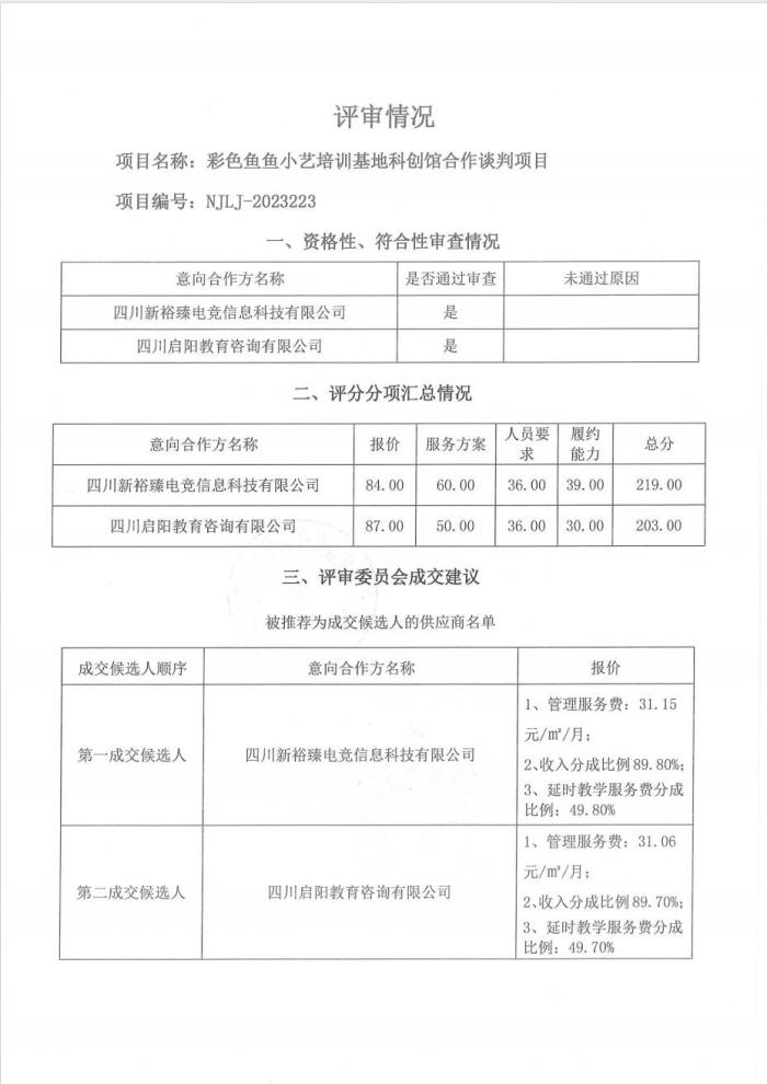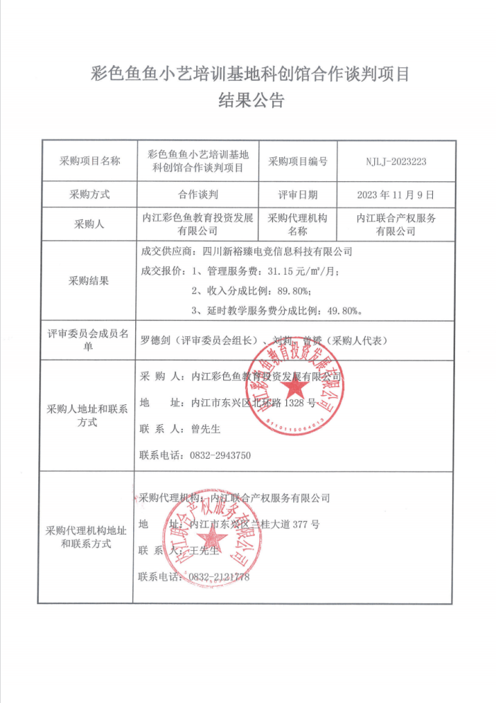 彩色魚魚小藝培訓(xùn)基地科創(chuàng)館合作談判項(xiàng)目結(jié)果公告