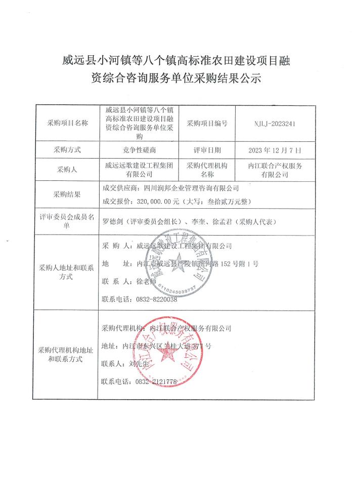 威遠(yuǎn)縣小河鎮(zhèn)等八個(gè)鎮(zhèn)高標(biāo)準(zhǔn)農(nóng)田建設(shè)項(xiàng)目融資綜合咨詢服務(wù)單位采購(gòu)結(jié)果公示