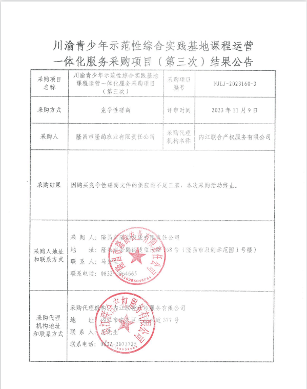 川渝青少年示范性綜合實踐基地課程運營一體化服務采購項目(第三次)結(jié)果公告