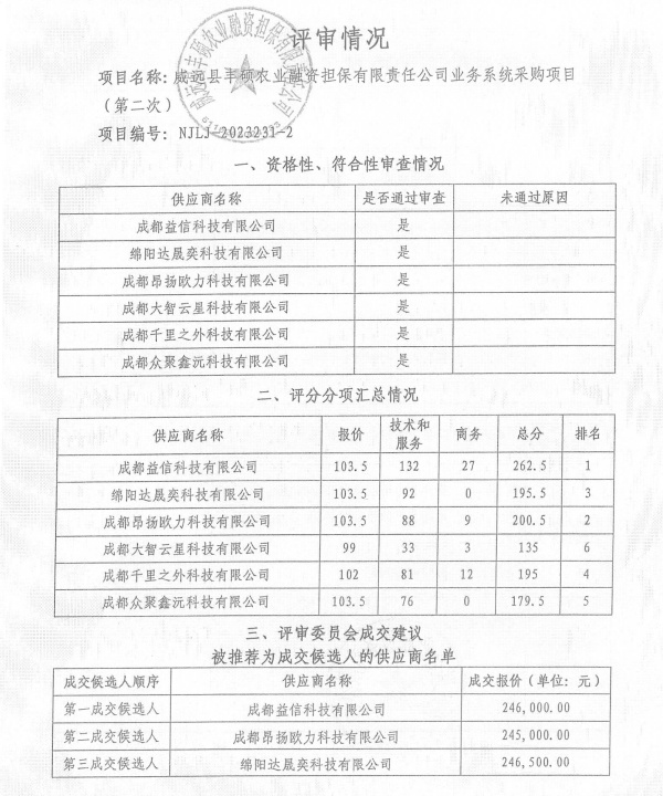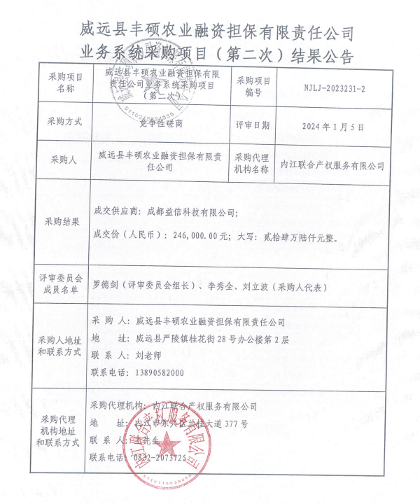威遠縣豐碩農(nóng)業(yè)融資擔(dān)保有限責(zé)任公司業(yè)務(wù)系統(tǒng)采購項目(第二次)結(jié)果公告
