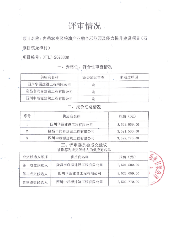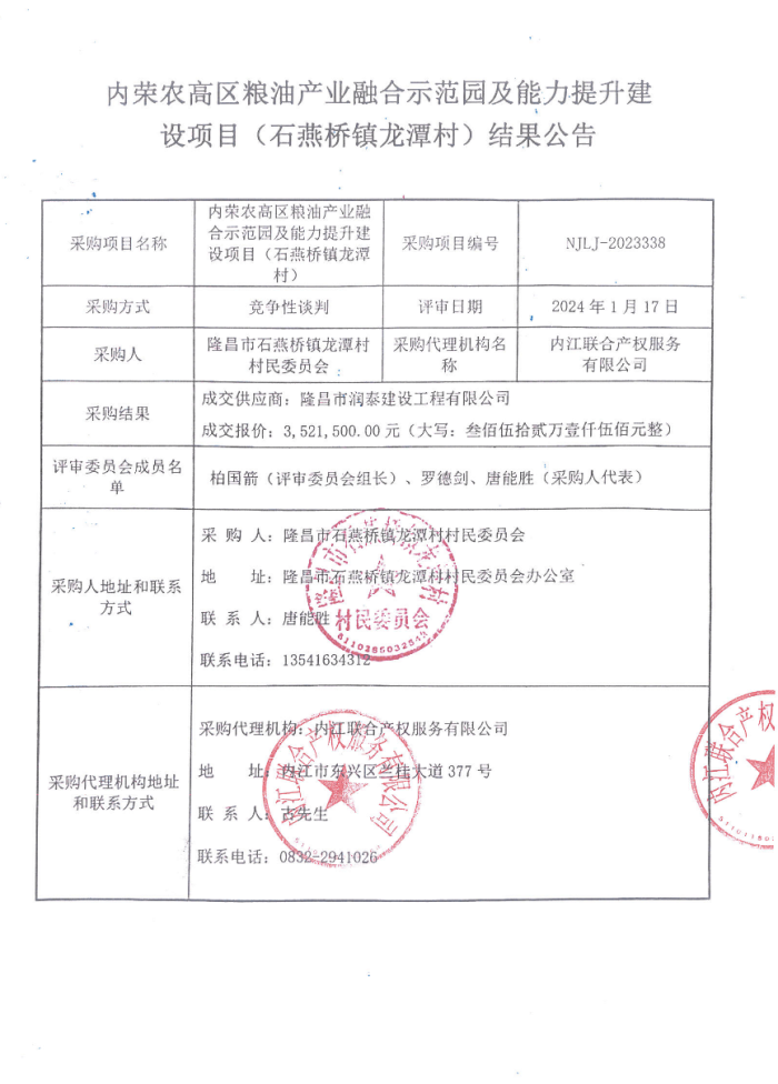 內(nèi)榮農(nóng)高區(qū)糧油產(chǎn)業(yè)融合示范園及能力提升建設項目(石燕橋鎮(zhèn)龍?zhí)洞澹┙Y(jié)果公告