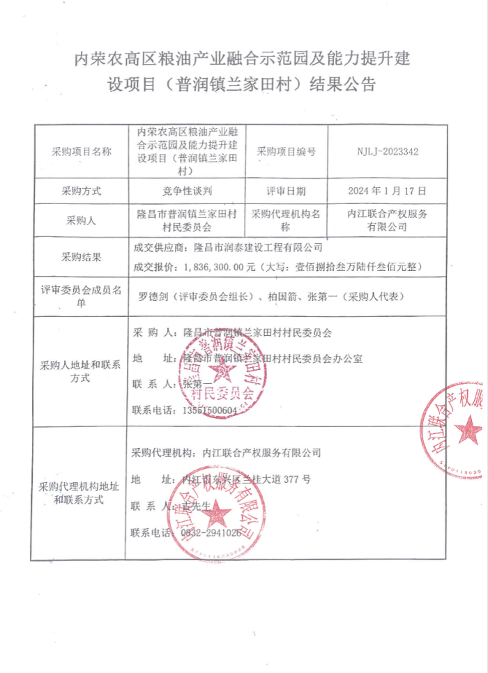 內(nèi)榮農(nóng)高區(qū)糧油產(chǎn)業(yè)融合示范園及能力提升建設(shè)項(xiàng)目(普潤(rùn)鎮(zhèn)蘭家田村)結(jié)果公告