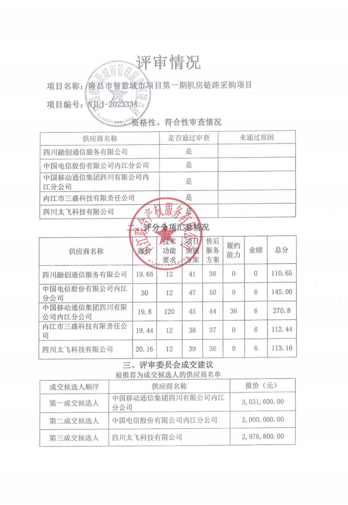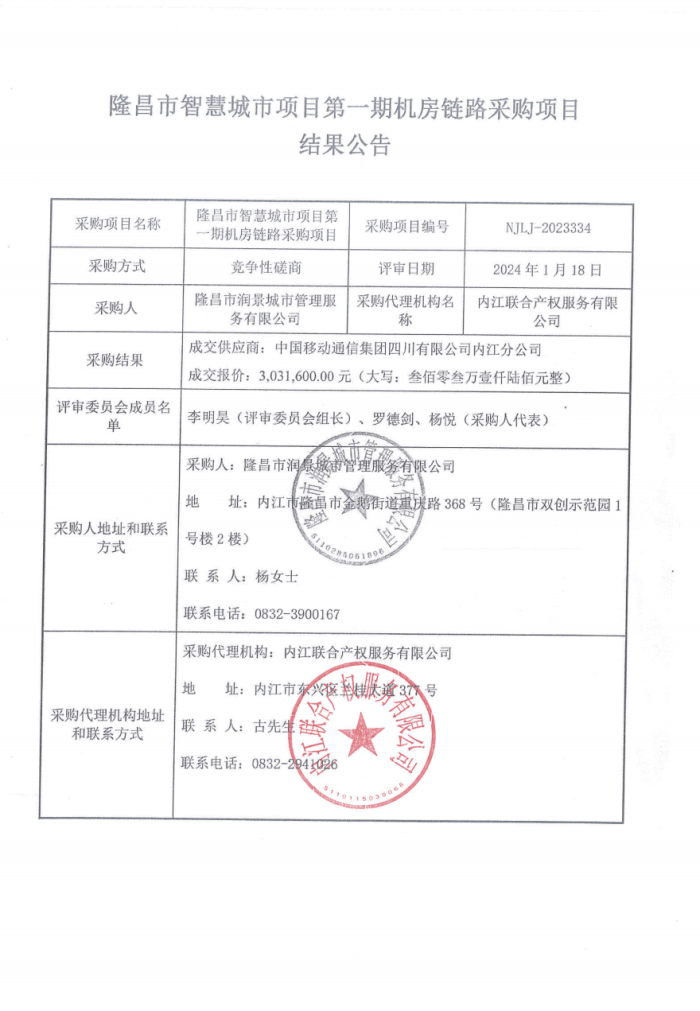 隆昌市智慧城市項目第一期機(jī)房鏈路采購項目結(jié)果公告