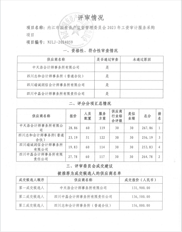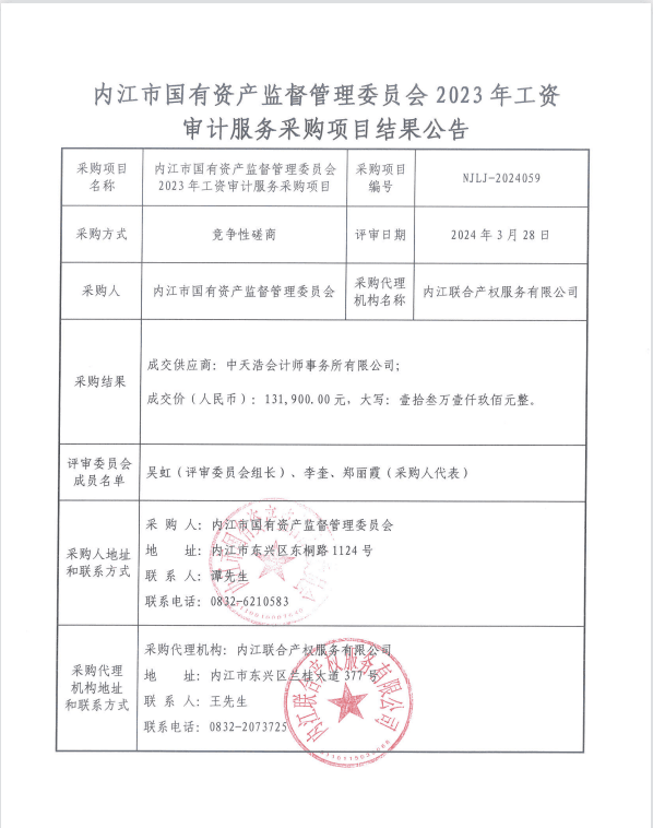 內江市國有資產(chǎn)監(jiān)督管理委員會2023年工資審計服務采購項目結果公告