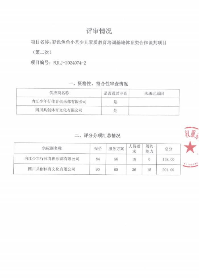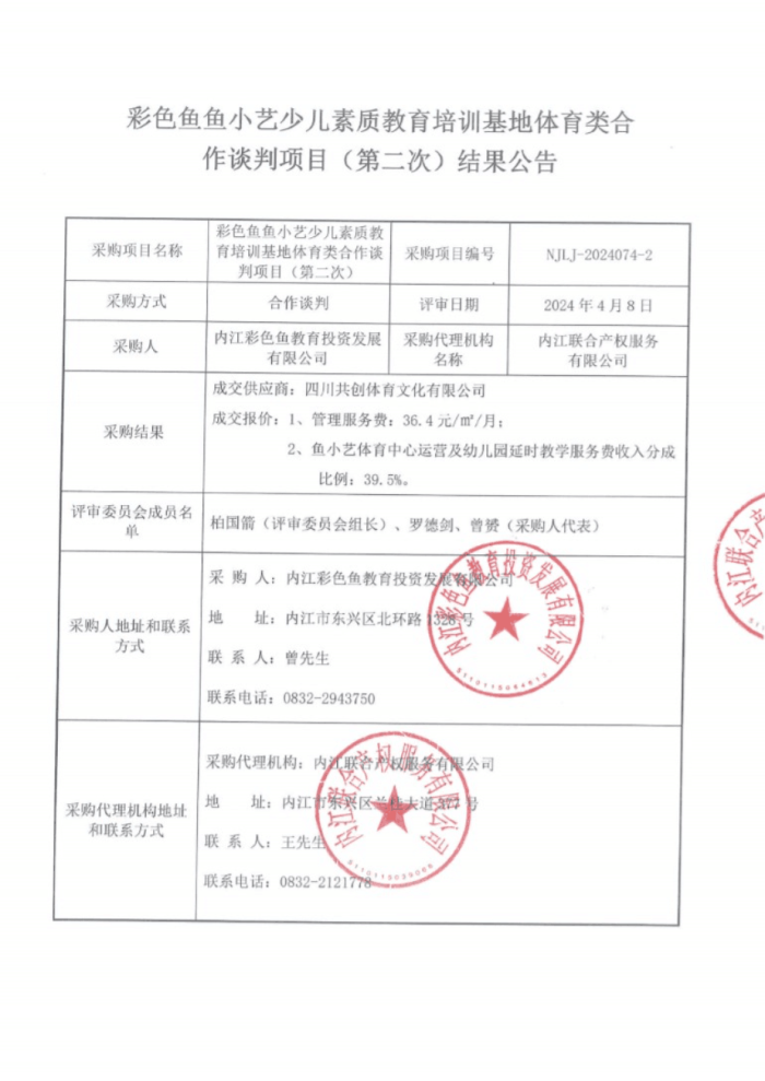 彩色魚魚小藝少兒素質(zhì)教育培訓基地體育類合作談判項目(第二次)結果公告