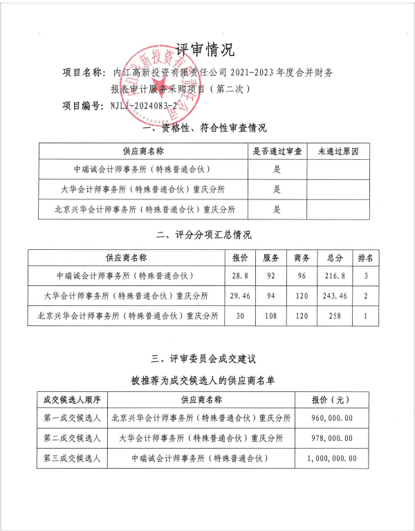 內(nèi)江高新投資有限責(zé)任公司2021-2023年度合并財務(wù)報表審計服務(wù)采購項目(第二次)結(jié)果公告