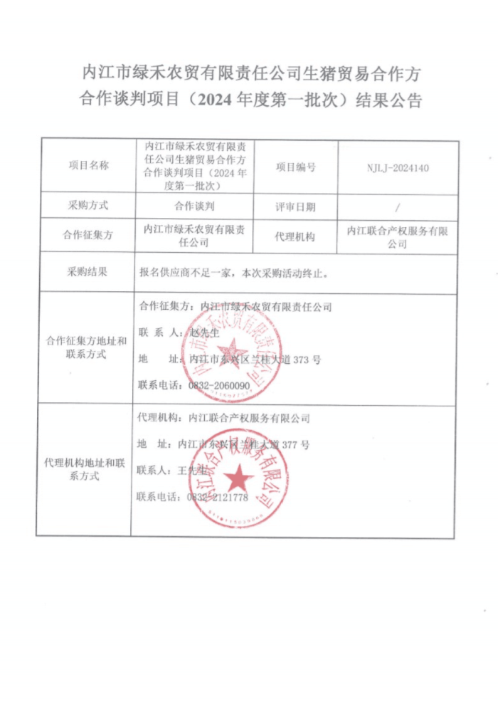 內(nèi)江市綠禾農(nóng)貿(mào)有限責(zé)任公司生豬貿(mào)易合作方合作談判項(xiàng)目(2024年度第一批次)結(jié)果公告