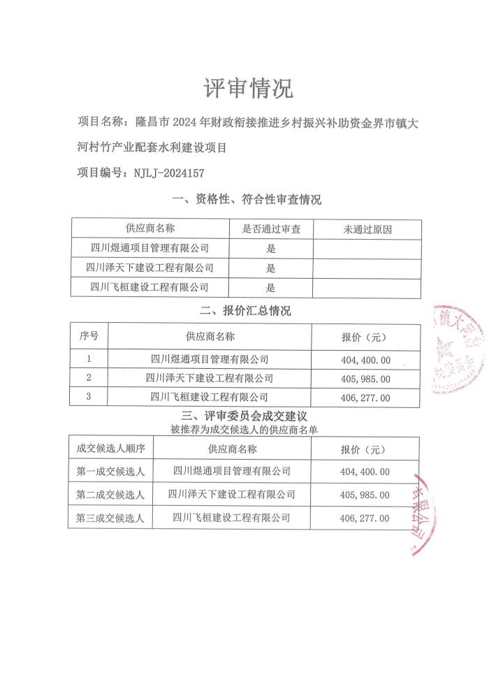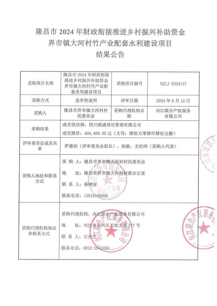 隆昌市2024年財(cái)政銜接推進(jìn)鄉(xiāng)村振興補(bǔ)助資金界市鎮(zhèn)大河村竹產(chǎn)業(yè)配套水利建設(shè)項(xiàng)目結(jié)果公告