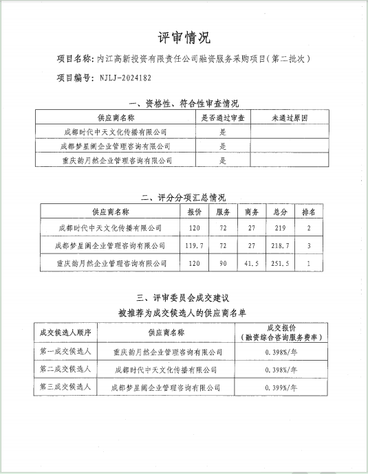 內(nèi)江高新投資有限責(zé)任公司融資服務(wù)采購項目(第二批次)結(jié)果公告