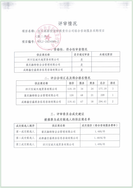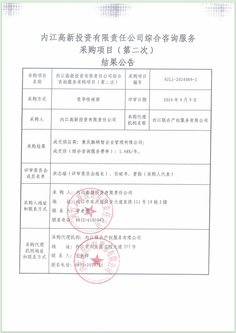內(nèi)江高新投資有限責(zé)任公司綜合咨詢服務(wù)采購項(xiàng)目(第二次)結(jié)果公告