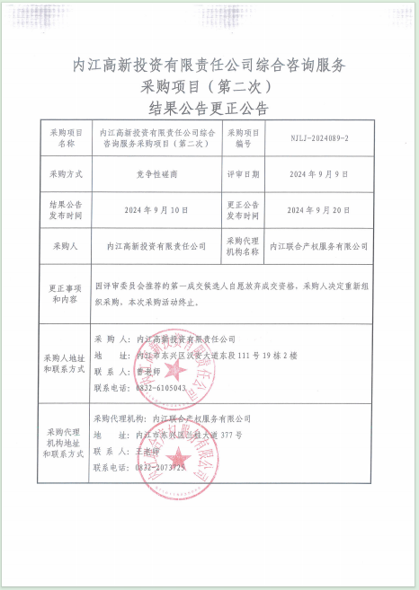 內(nèi)江高新內(nèi)江高新投資有限責(zé)任公司綜合咨詢服務(wù)采購項目(第二次)結(jié)果公告更正公告