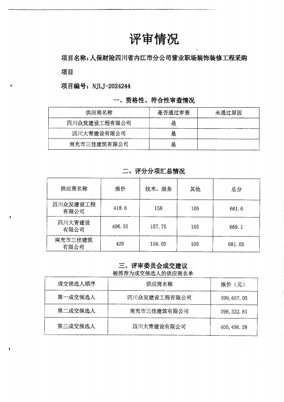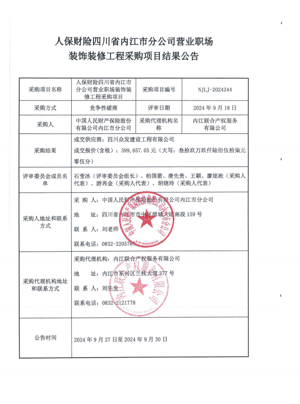 人保財(cái)險(xiǎn)四川省內(nèi)江市分公司營業(yè)職場(chǎng)裝飾裝修工程采購項(xiàng)目結(jié)果公告