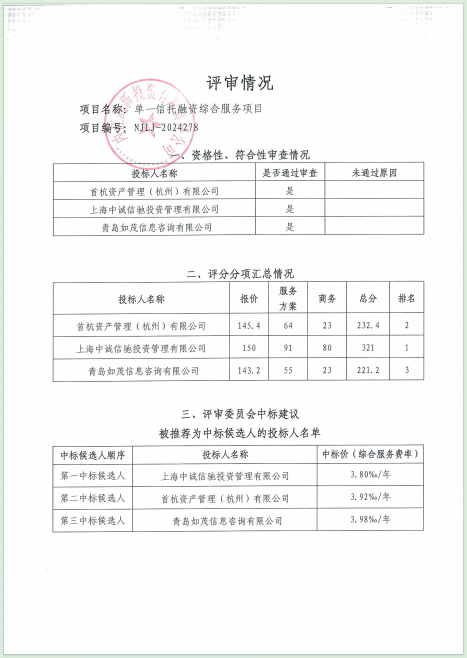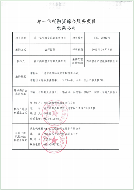單一信托融資綜合服務(wù)項目結(jié)果公告