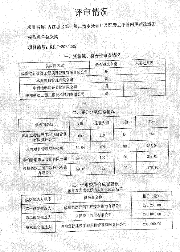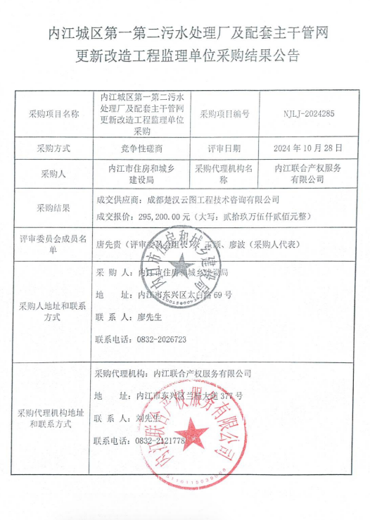 內(nèi)江城區(qū)第一第二污水處理廠及配套主干管網(wǎng)更新改造工程監(jiān)理單位采購(gòu)結(jié)果公告