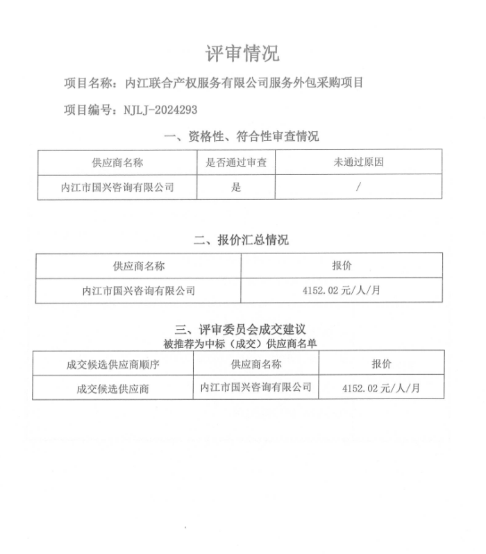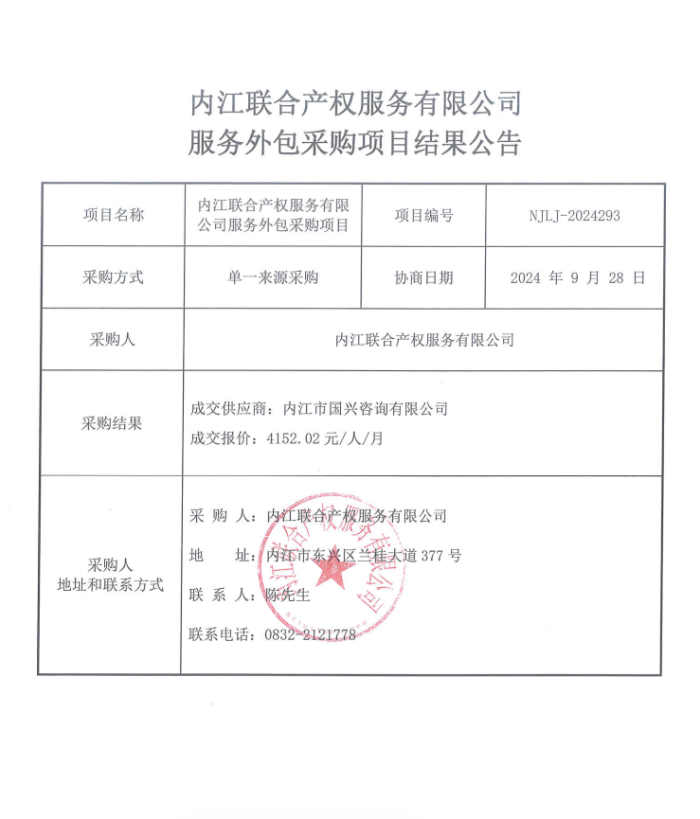 內(nèi)江聯(lián)合產(chǎn)權(quán)服務(wù)有限公司服務(wù)外包采購(gòu)項(xiàng)目結(jié)果公告
