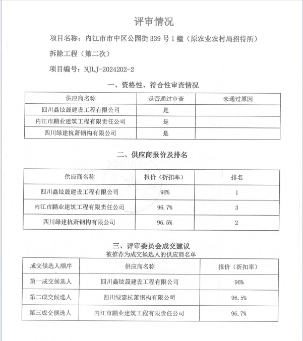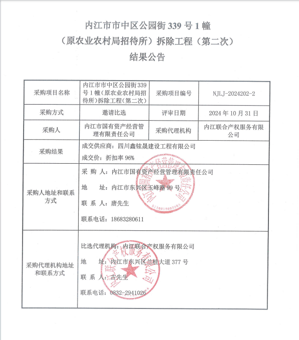 內(nèi)江市市中區(qū)公園街339號(hào)1幢 (原農(nóng)業(yè)農(nóng)村局招待所)拆除工程(第二次)結(jié)果公告