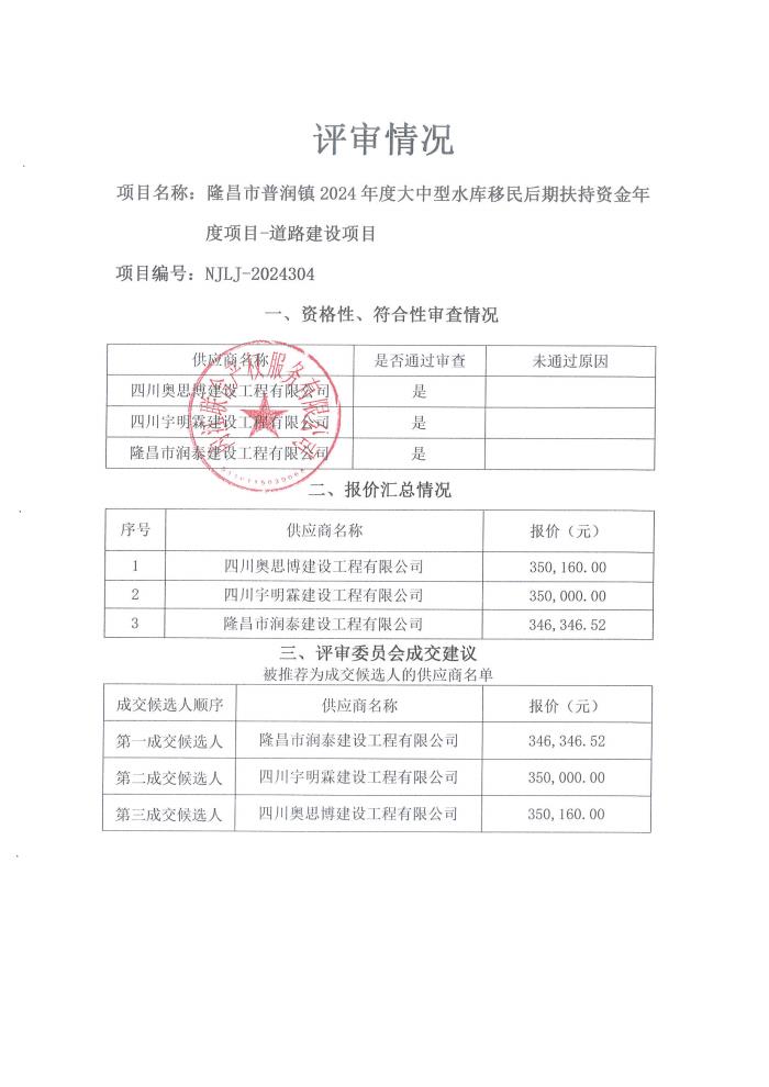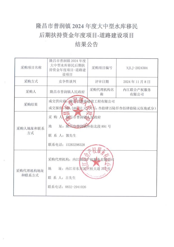 隆昌市普潤鎮(zhèn)2024年度大中型水庫移民后期扶持資金年度項目-道路建設項目結(jié)果公告
