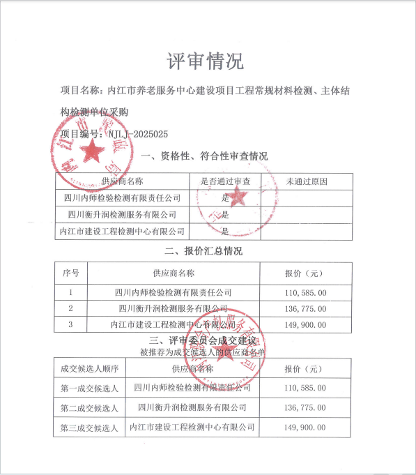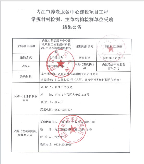 內(nèi)江市養(yǎng)老服務(wù)中心建設(shè)項(xiàng)目工程 常規(guī)材料檢測、主體結(jié)構(gòu)檢測單位采購結(jié)果公告