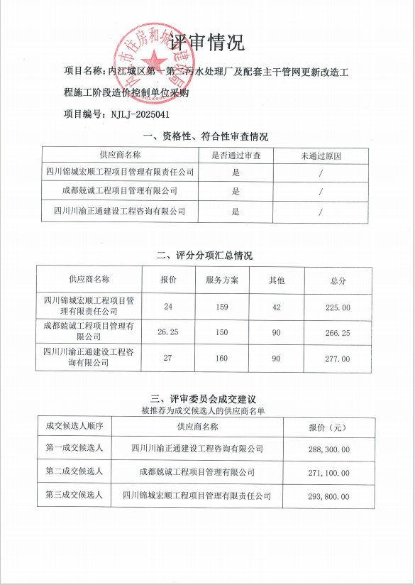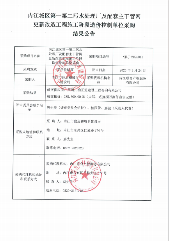 內(nèi)江城區(qū)第一第二污水處理廠及配套主干管網(wǎng)更新改造工程施工階段造價(jià)控制單位采購結(jié)果公告